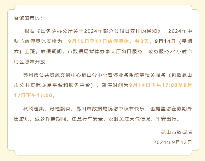 昆山市数据局2024年中秋节放假通知